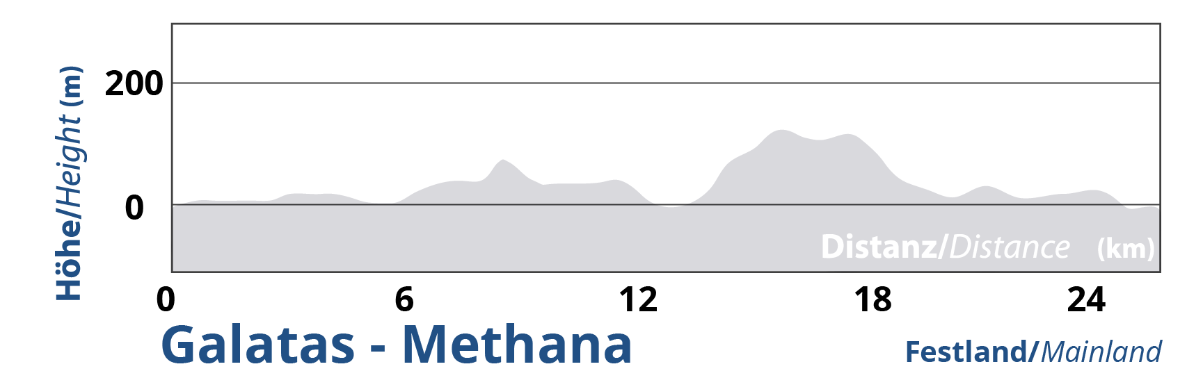 Reiseroute ab Athen / bis Athen Dauer 8 Tage / 7 Nächte Strecke ca. 125 km Level 2 / 5 Level 1 / 5 Radtouren durch überwiegend flaches Gelände, meist auf asphaltierten Radwegen oder gut befestigten Wegen. Geeignet für Radfahrer, die gelegentlich im Sattel sitzen aber auch mehrstündige Radtouren bewältigen können. Level 2 / 5 Radtouren durch leicht hügeliges Gelände mit Anstiegen bis ca. 150 Höhenmeter. Meist auf asphaltierten Radwegen und wenig befahrenen Straßen oder gut befestigten Wegen. Geeignet für Radfahrer, die mehrstündige Radtouren mögen. Level 3 / 5 Radtouren durch hügeliges Gelände mit längeren Anstiegen bis auf ca. 250 Höhenmeter (mit E-Bike einfach zu bewältigen). Meist auf asphaltierten Straßen, gelegentlich auf unbefestigten Wegen. Geeignet für Radfahrer, die regelmäßig im Sattel sitzen Level 4 / 5 Radtouren durch hügeliges bis bergiges Gelände mit teils steileren Anstiegen bis auf ca. 400 Höhenmeter (mit E-Bike gut zu bewältigen). Erfordert sicheres Fahren auf serpentinenreichen Abfahrten und gelegentlich auch auf Kieswegen. Level 5 / 5 Radtouren durch bergiges Gelände mit anspruchsvollen Anstiegen von über 500 Höhenmetern (mit E-Bike gut zu bewältigen). Erfordert eine sehr gute Fahrradbeherrschung, auch auf Abfahrten mit teils steilen Spitzkehren und unbefestigten Wegen. Teilen via ... E-Mail Whatsapp Facebook Twitter Link kopieren